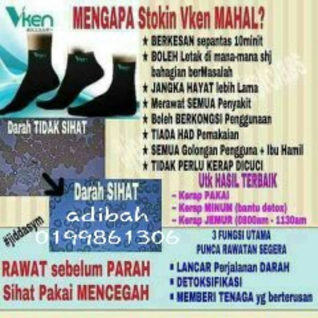 Mampu diguna affordable Gunalah Produk Vken Untuk Badan Yang Sihat. Cara kerja stokin ajaib vken Stokin ini tidak merawat penyakit secara spesifik tetapi lebih kepada merawat sel-sel darah di dalam badan anda. Jadi pengguna tidak perlu risau tentang kesan sampingan.